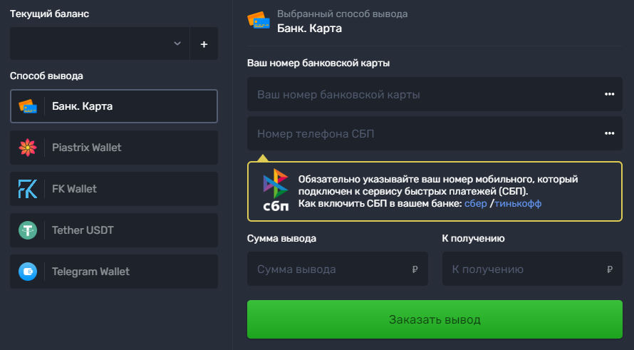 Для пополнения и вывода баланса для пользователей доступны следующие способы:
