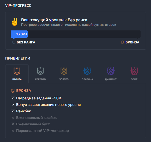 Программа лояльности на сайте имеет хорошие бонусы для игроков. Всего доступно 6 рангов: Бронза, серебро, золото, платина, диамант, элит. С каждым рангом повышается бонус за выполнения задания, процент рейкбека, процент еженедельного кешбека. С уровня «Золото» появляется ежемесячный буст (денежный бонус, зависящий от активности на сайте).