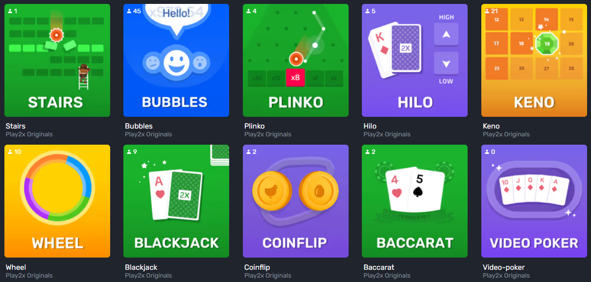 Play2x – это игровой сайт, предоставляющий широкий перечень из 20 оригинальных игр на сайте, что делает его уникальным среди других.