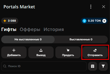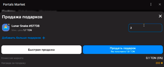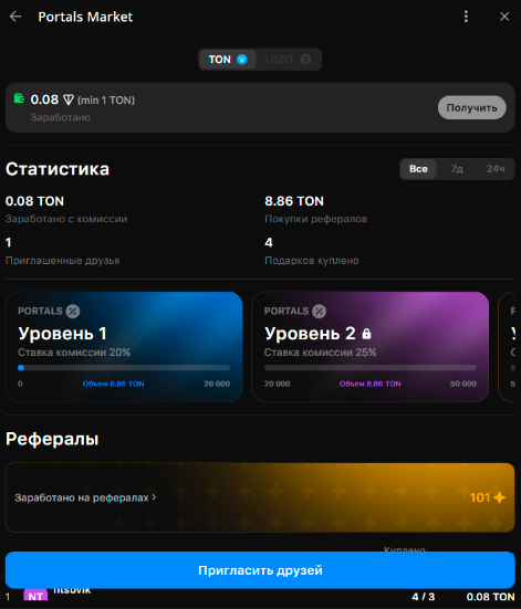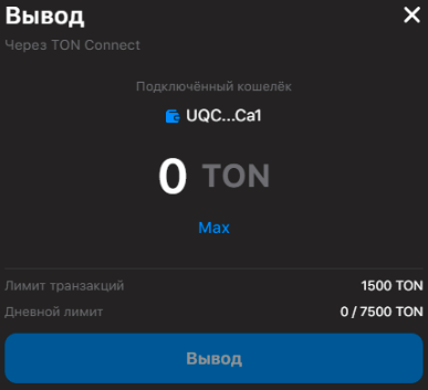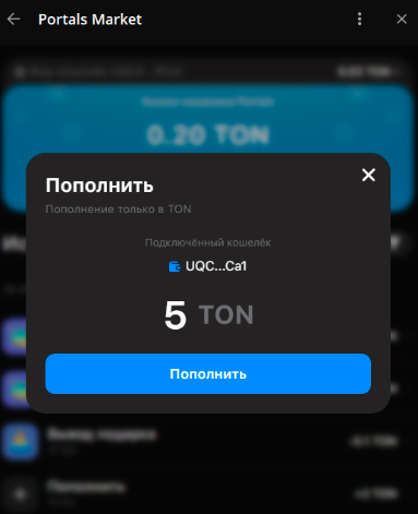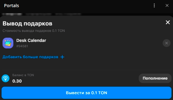 После продажи TON зачисляются на баланс в Portals. Перейдите в раздел «Баланс», нажмите «Вывод», укажите сумму и дождитесь перевода на ваш TON-кошелёк.