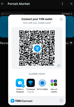 Для покупок привяжите TON-кошелёк к аккаунту Portals. Кнопка привязки находится в правом верхнем углу интерфейса. Выберите любой доступный TON-кошелёк и подключите его.