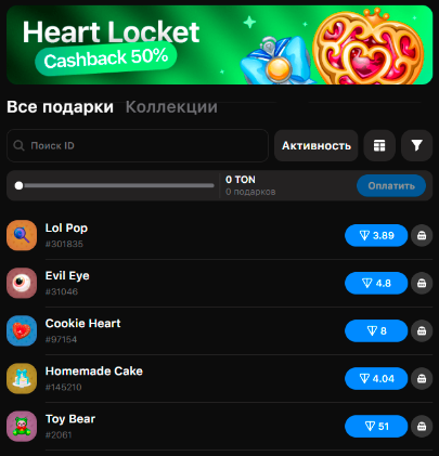 После траты 100 TON на покупки начисляется кэшбэк от 5% до 25%. Во время акций кэшбэк на отдельные NFT-подарки может достигать 50%.