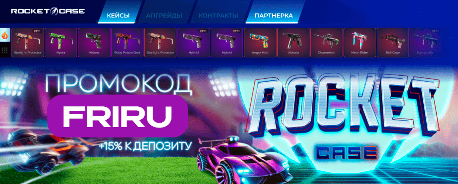 Промокоды. Это специальные коды, которые добавляют бонусный процент к сумме пополнения баланса. Для читателей нашего обзора доступен уникальный промокод «FRIRU», обеспечивающий +15% к любому депозиту! Дополнительные промокоды можно найти в официальных соцсетях платформы Rocketcase.