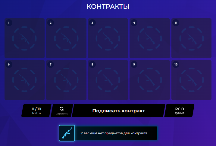 В режиме «Контракты» игрокам предлагается объединить от 3 до 10 скинов, чтобы получить один скин более высокого качества. Это интересный способ обновить инвентарь, особенно если у вас накопилось несколько ненужных предметов.