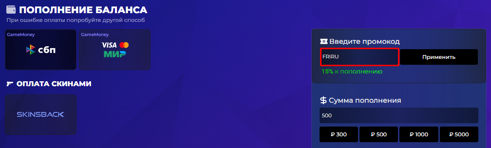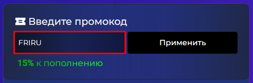 Во вкладке "Пополнить баланс" активируем промокод "FRIRU".