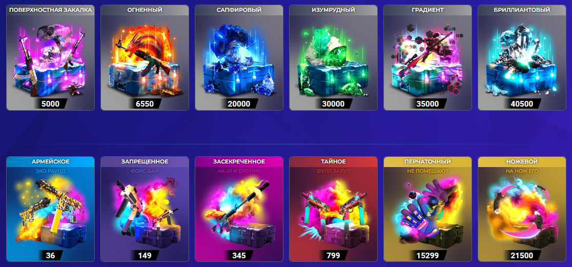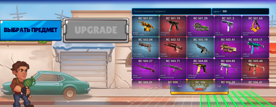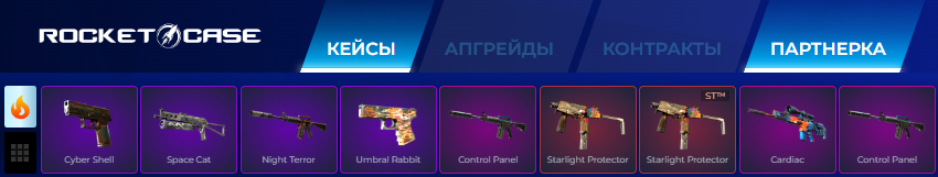 Этот игровой режим позволяет улучшить ваш скин до более дорогого экземпляра. Шанс успеха зависит от разницы в стоимости между вашим скином и желаемым. Режим «Апгрейды» выделяется на Rocketcase своим уникальным дизайном и приятным визуальным оформлением, что делает процесс ещё увлекательнее.