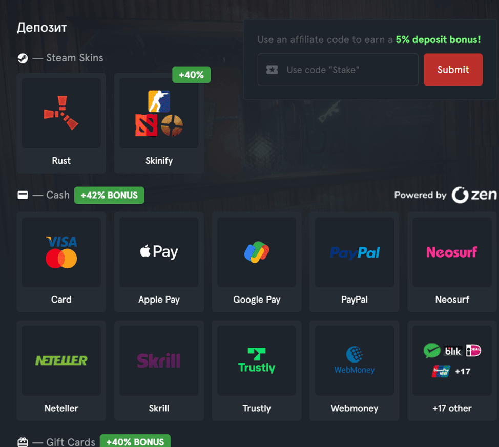 Вывод средств же доступен скинами Rust, а также криптовалютами Bitcoin, Ethereum, Litecoin.