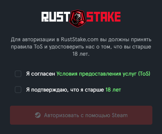 На сайте есть только один способ регистрации – с помощью Steam аккаунта. Для регистрации требуется ознакомиться с политикой сайта, а также подтвердить то, что пользователю больше 18 лет.