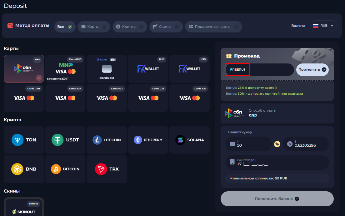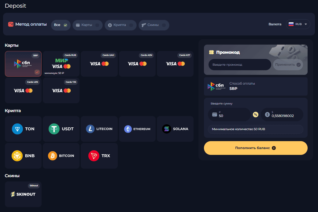 На платформе Skinhouse пользователи могут пополнить баланс с использованием различных методов: