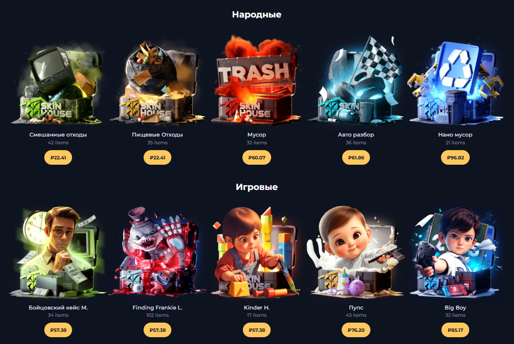 Skinhouse предлагает пользователям исключительно открытие кейсов. На сайте отсутствуют апгрейды и контракты, однако это не снижает привлекательности платформы. Ассортимент кейсов огромен и разнообразен, что позволяет каждому пользователю найти что-то по своему вкусу. На платформе представлены только персональные сборки кейсов — возможности открытия кейсов из оригинальной игры нет. Удобный поиск по цене и названию помогает быстро найти нужный кейс по оптимальной стоимости.