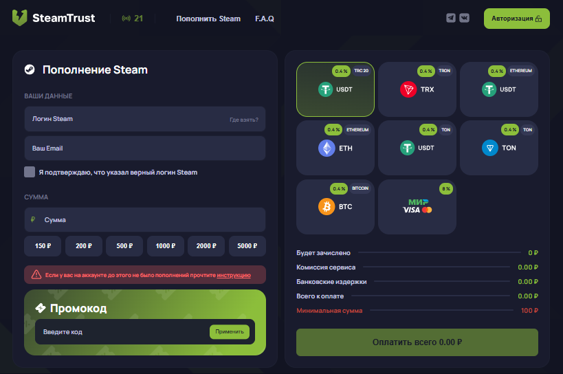 SteamTrust – это удобная площадка для пополнения баланса Steam-аккаунта с минимальными комиссиями и издержками. Сервис радует пользователей бонусными промокодами, разнообразными способами оплаты и простым интерфейсом.