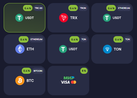 Криптовалюты: USDT, TRON, Ethereum, TONCoin, Bitcoin.