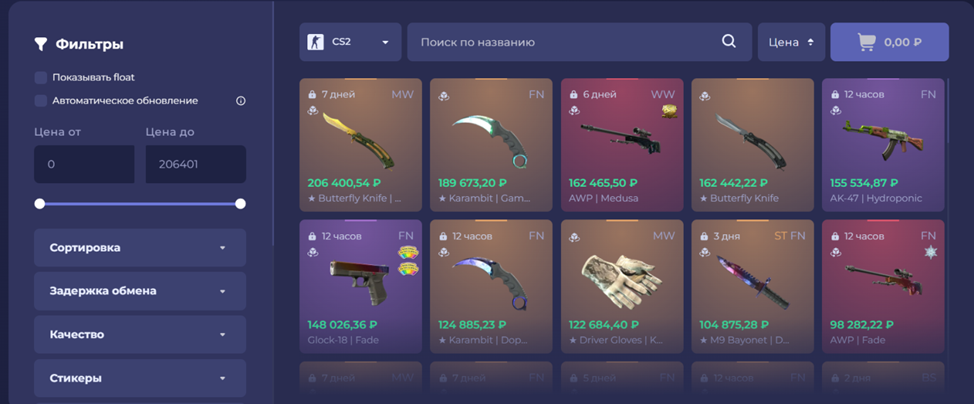 Skin prices are determined by various factors such as item prices on all platforms, including Steam, and item liquidity. Thus, AIMMARKET prices are among the most competitive. Trade offers to transfer skins to bots come within 3-4 minutes of purchase or sale.