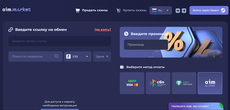 The only way to register on the AIMMarket site is through Steam. After registration, all that remains is to enter your current trade link.
