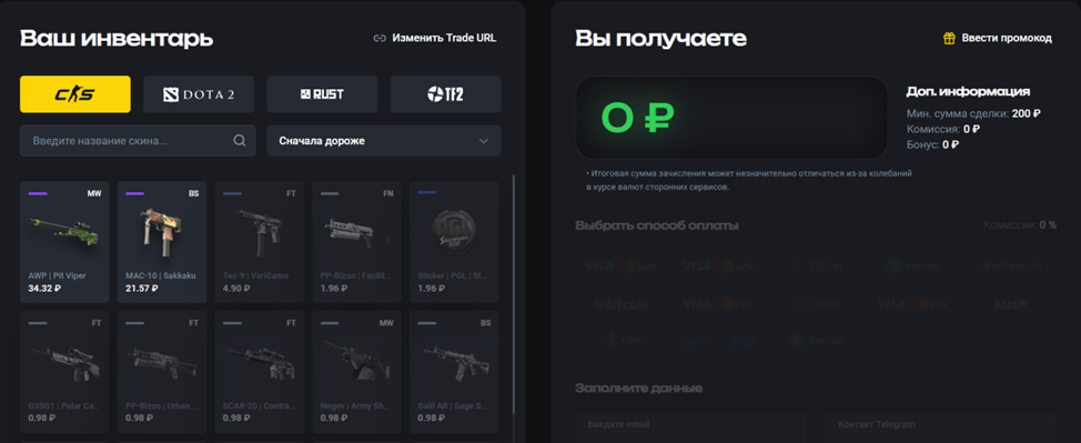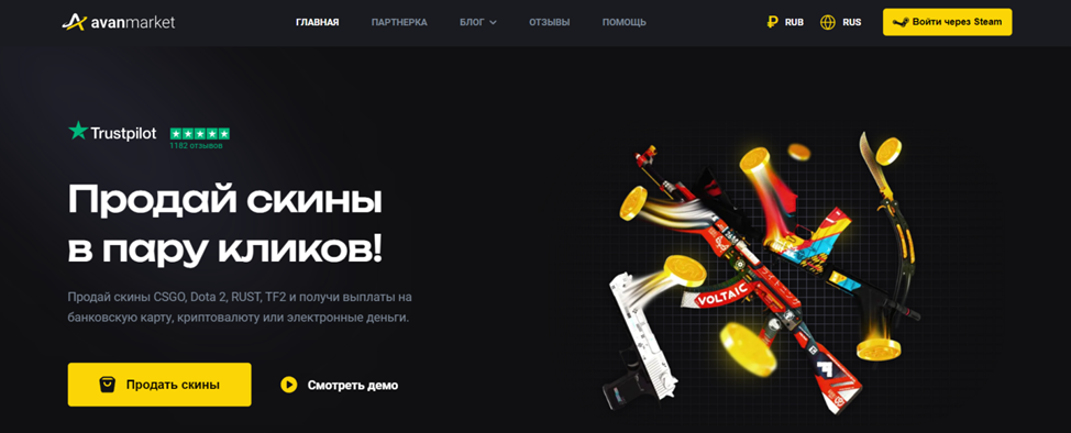 AvanMarket - a platform for selling skins from games such as CS2, Rust, DOTA2, TF2. The website allows withdrawing funds to bank cards, electronic and cryptocurrency wallets.