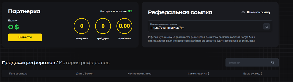 AvanMarket is a convenient platform for quickly selling skins from CS2, DOTA2, TF2, and Rust, which offers one of the lowest price differences between the site and Steam. However, one of the downsides is the absence of any bonus programs on the site except for the referral one.