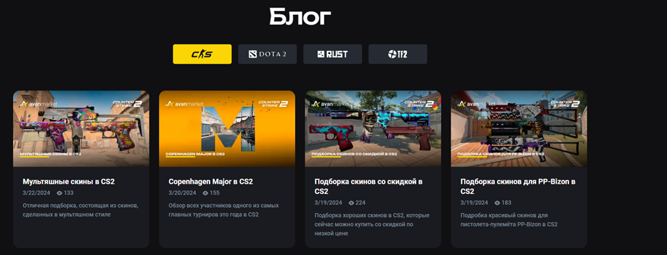 AvanMarket has an interesting "Blog" section where you can find relevant articles on CS2, DOTA2, Rust, and Team Fortress 2.