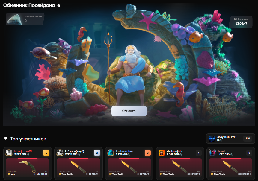 A special event where players exchange Megalodon fangs, obtained from "Mysteries of the Underwater World" themed cases, for skins. The top 200 players by exchanges receive exclusive rewards.