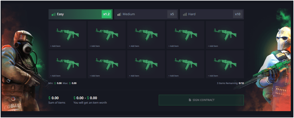 Players add 3 to 10 skins to the contract. The more skins and the higher their price, the better quality skin will be received from the contract.