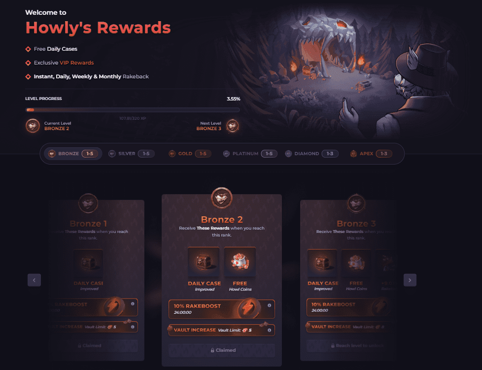 Loyalty Program: Players have access to 6 ranks with 5 levels each – Bronze, Silver, Gold, Platinum, Diamond, Apex. Each level corresponds to a % rakeback and receiving free coins on the site.