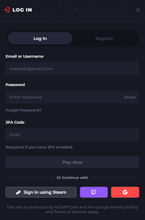 Registration is available through 4 methods: via Steam, Google, Twitch, or by entering one's email, phone number, name, and creating a password.
